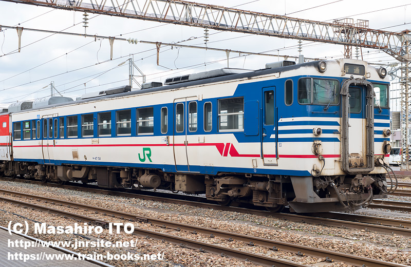 写真の キハ47 511 は、2001(平成13)年度に駆動用機関(エンジン)をカミンズ製の DMF14HZ(350PS/2,000rpm)に換装しましたが、液体変速機(DW10)を交換されなかったため、定格出力を300PSに下げて使用されました。