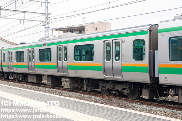 でも、E231系900番代の中間車は209系500番代とほぼ外観をしているので、電装品を搭載していない付随車はサハE231形900番代とサハ209形500番代を見分けるのは困難です。
