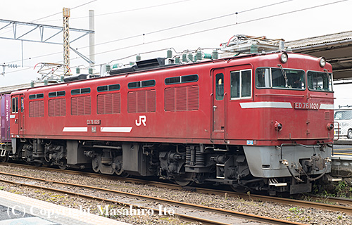 1979(昭和54)年8月に東芝で落成し鹿児島機関区(鹿)に配置され、現在も門司機関区(門)の配置で北九州貨物ターミナル〜鹿児島間などで活躍している ED76 1020 です。