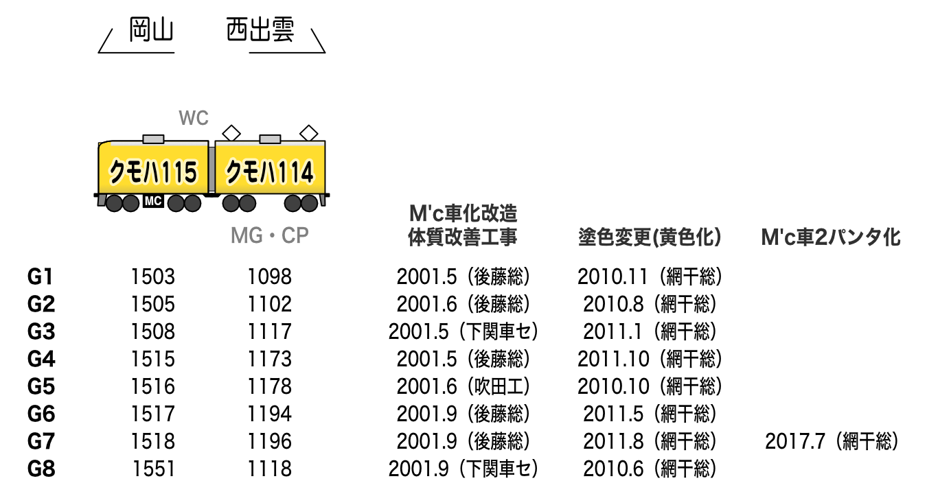 下関総合車両所岡山電車支所のG編成は上の編成イラストのように8編成が在籍しています。